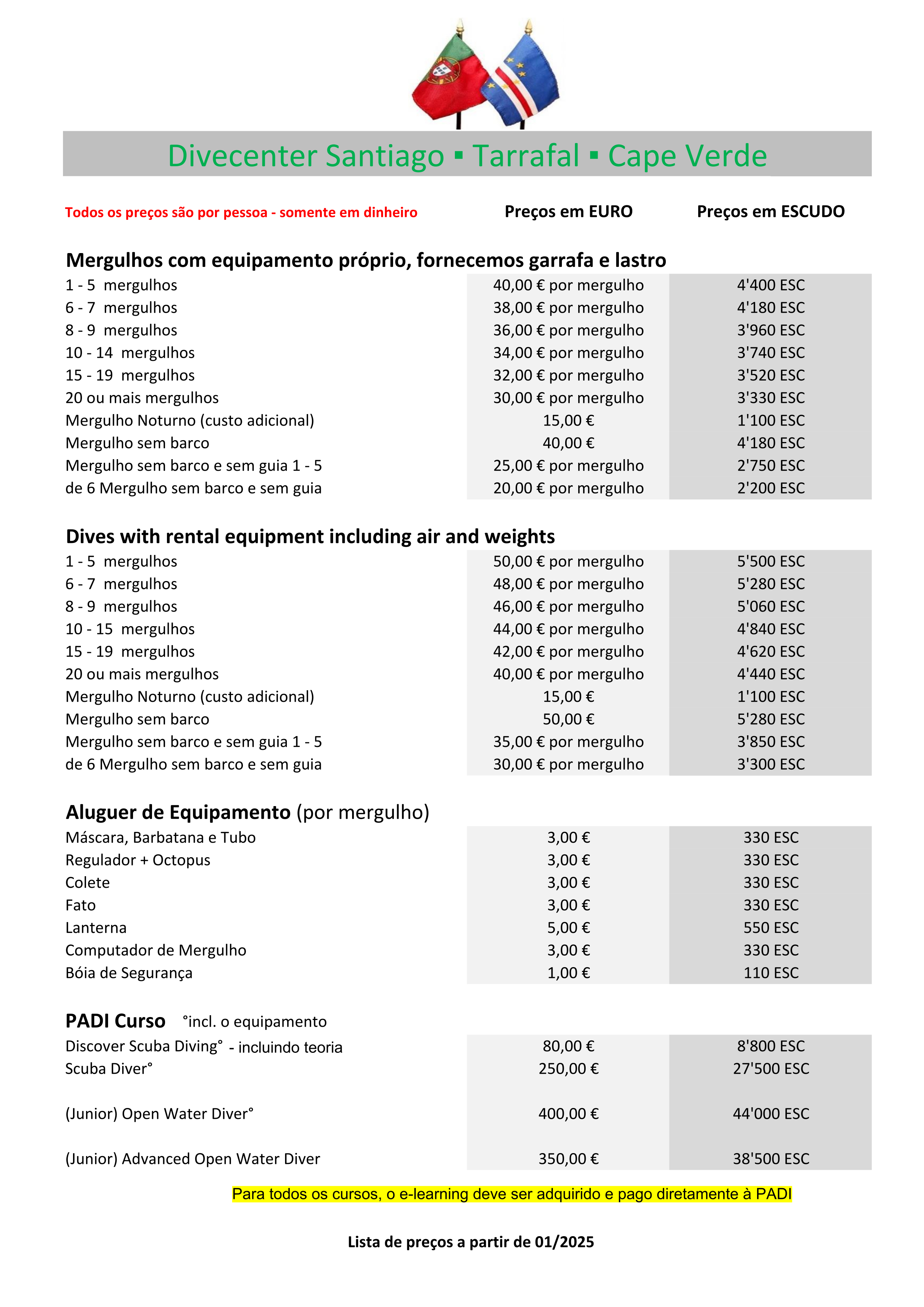 Preços - Divecenter Santiago, Centro Mergulho Santiago, Santiago divecenter
