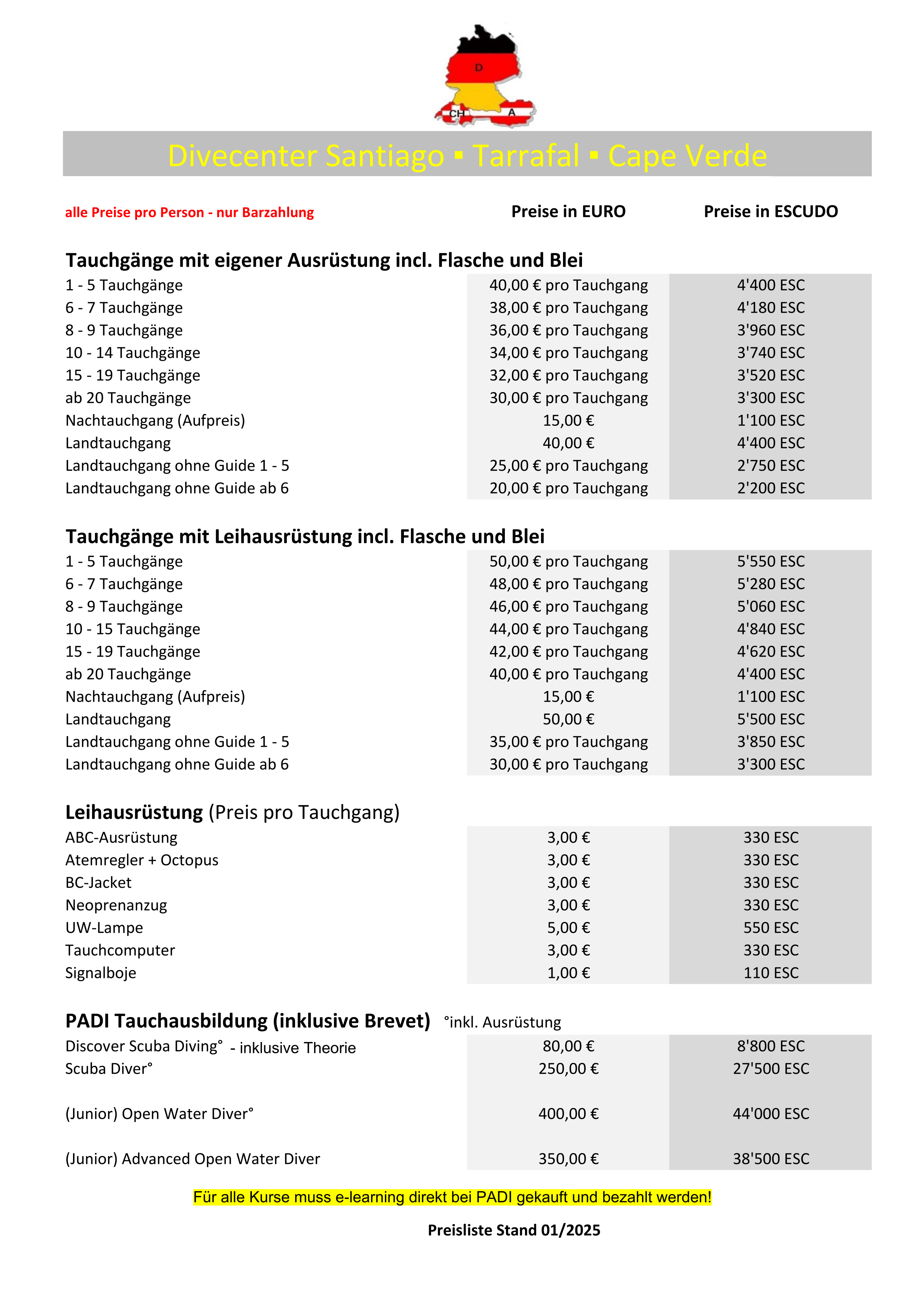 Preisliste - Divecenter Santiago, Centro Mergulho Santiago, Santiago divecenter